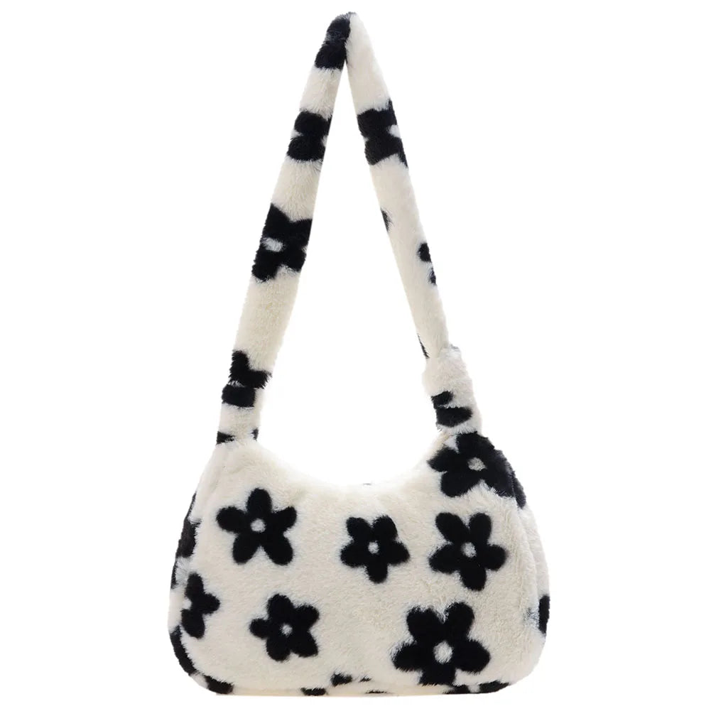 This vintage handbag features a plush fur flower pattern, making it a perfect winter accessory. It is a casual small armpit bag that can also be used as a coin purse for ladies.