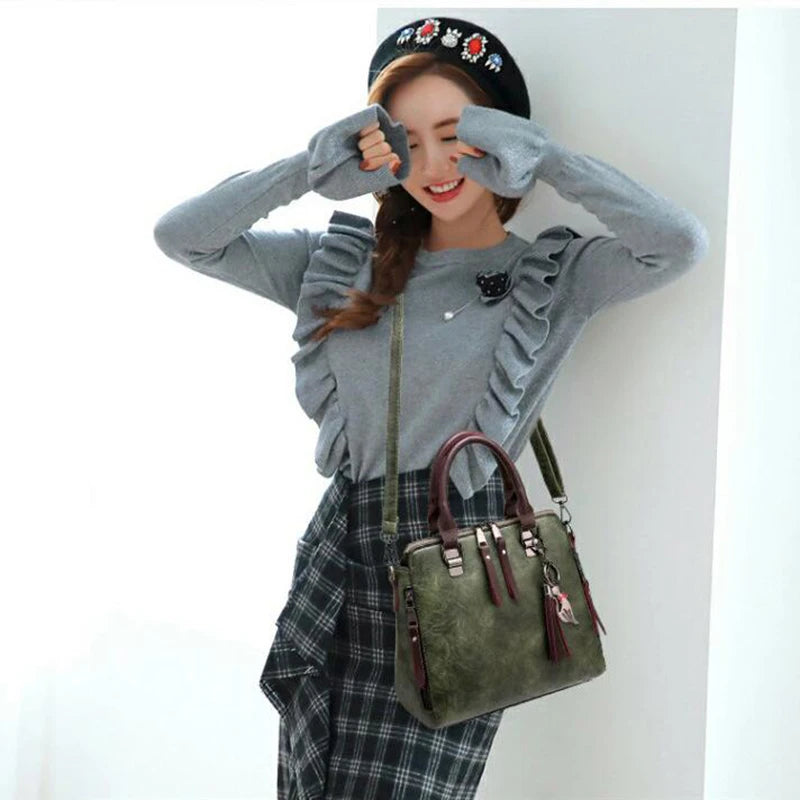 Elegant and stylish vintage PU leather handbag with tassel detail, perfect for everyday use.