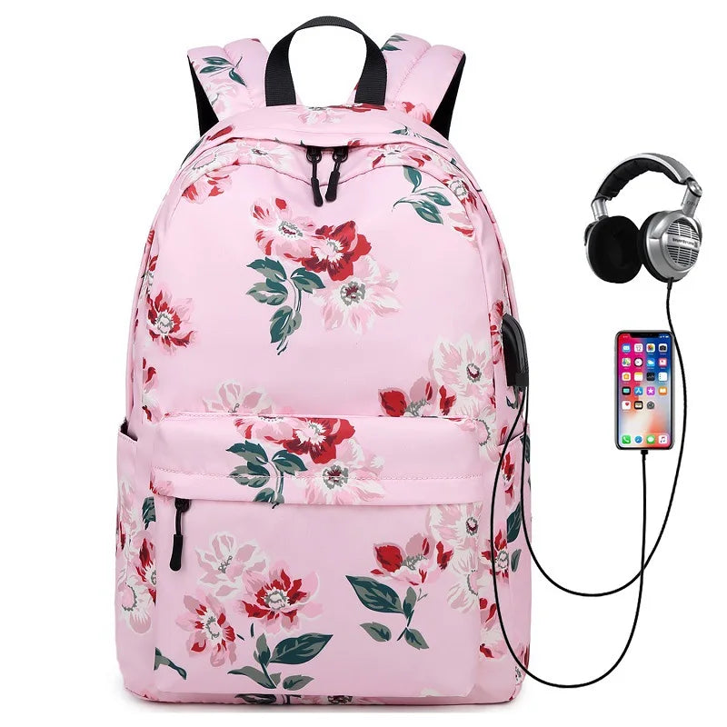 This stylish school backpack features a floral design, waterproof nylon material, USB charging port, ideal for college girls. Perfect for travel, it also functions as a laptop backpack.