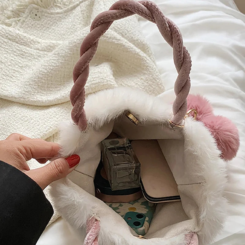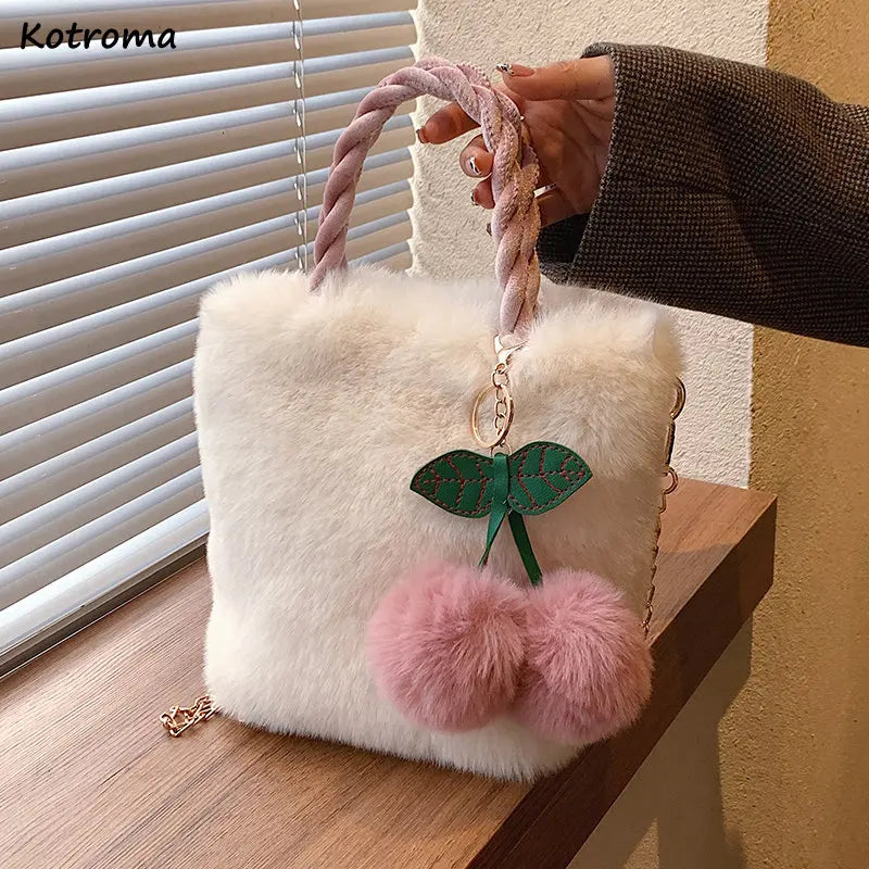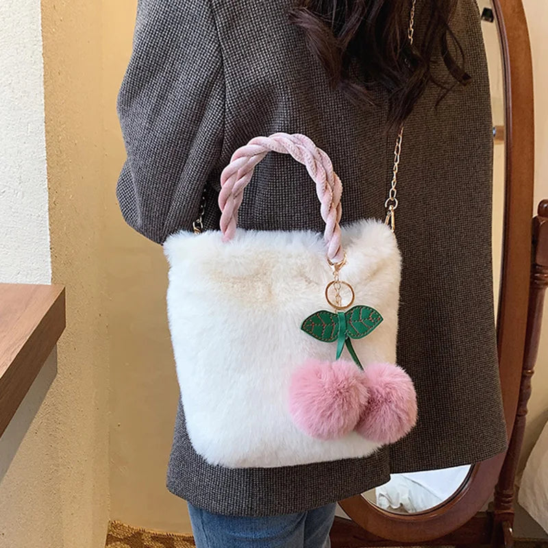 Winter Plush Cherry Shoulder Bag Women Cross-body Furry Bucket Handbag