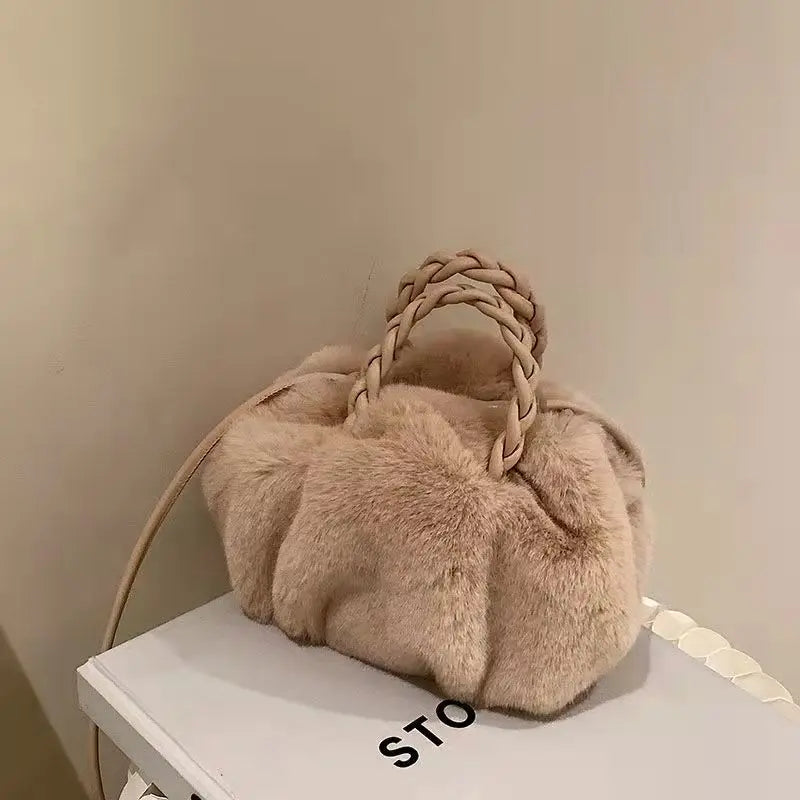 Stay cozy and stylish with this winter plush cloud bag made of faux fur. Perfect for winter outings, this mink fur crossbody bag is a chic addition to any outfit.