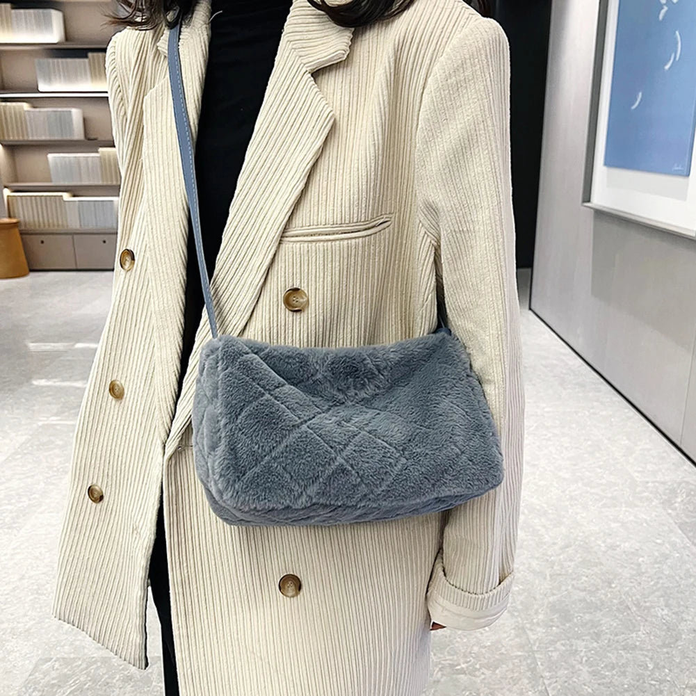 Winter Plush Rhombus Faux Fur Handbag Tote Purse Ladies Shoulder Bag