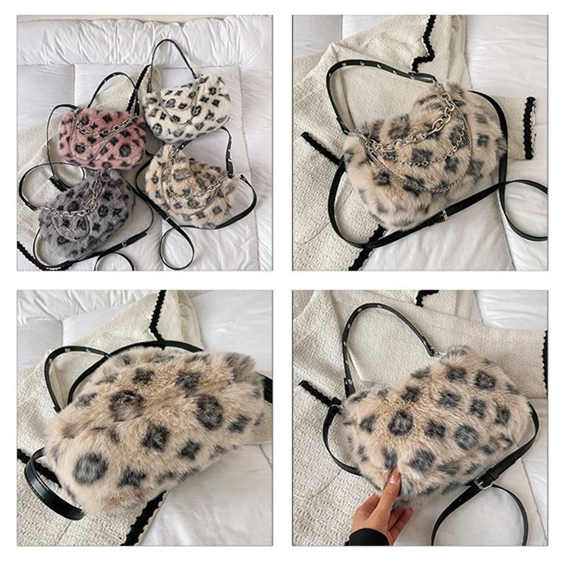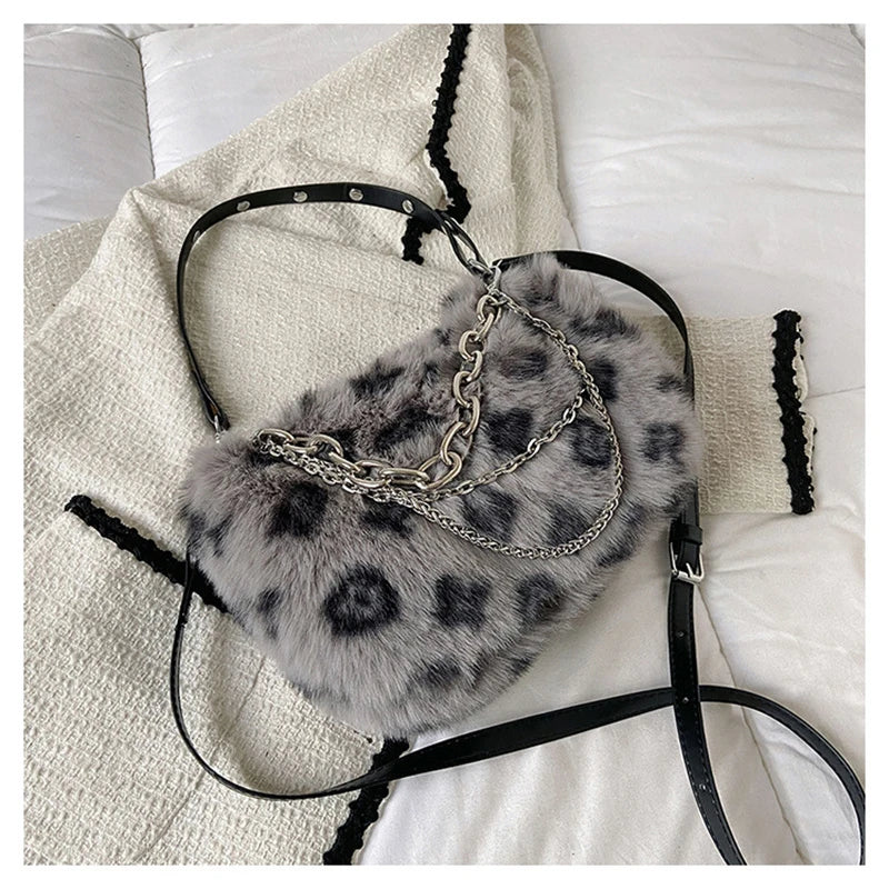 Stay cozy and stylish with this plush underarm shoulder bag featuring fur and chain details. Perfect for winter outings.