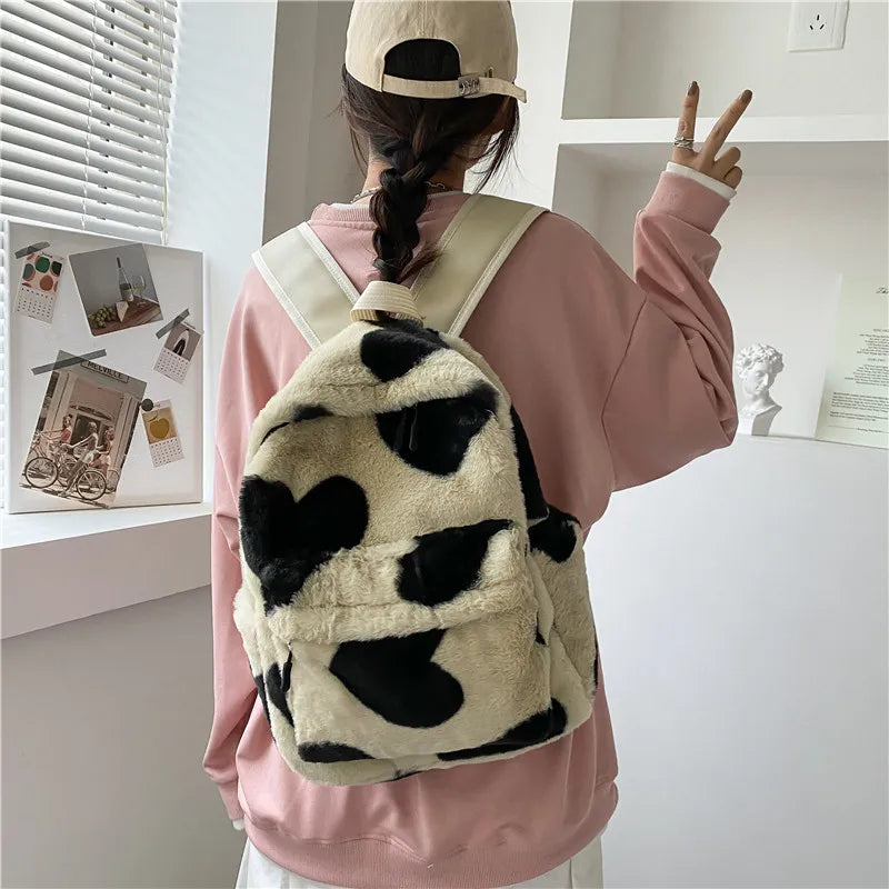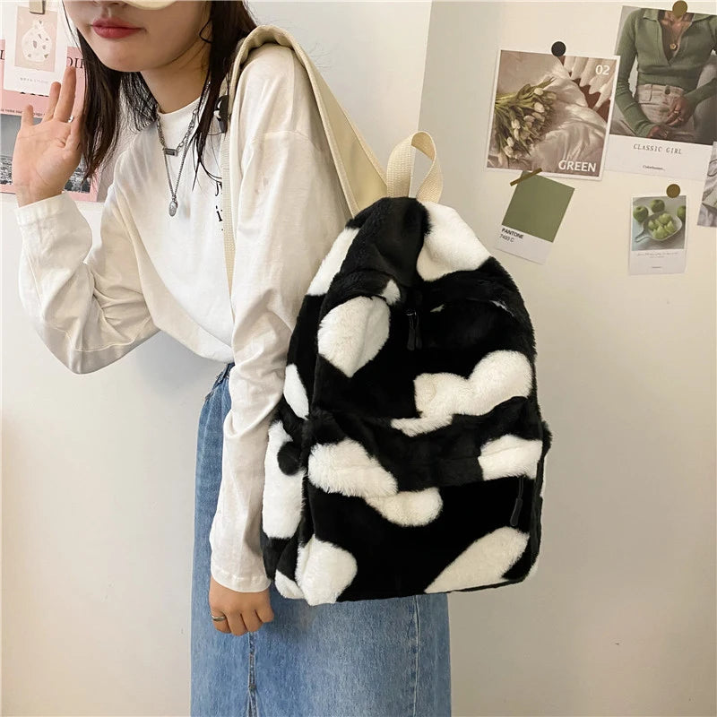 Stay stylish and cozy with this soft plush backpack featuring a trendy cow print design. Perfect for teenagers or women heading back to school in the winter season.