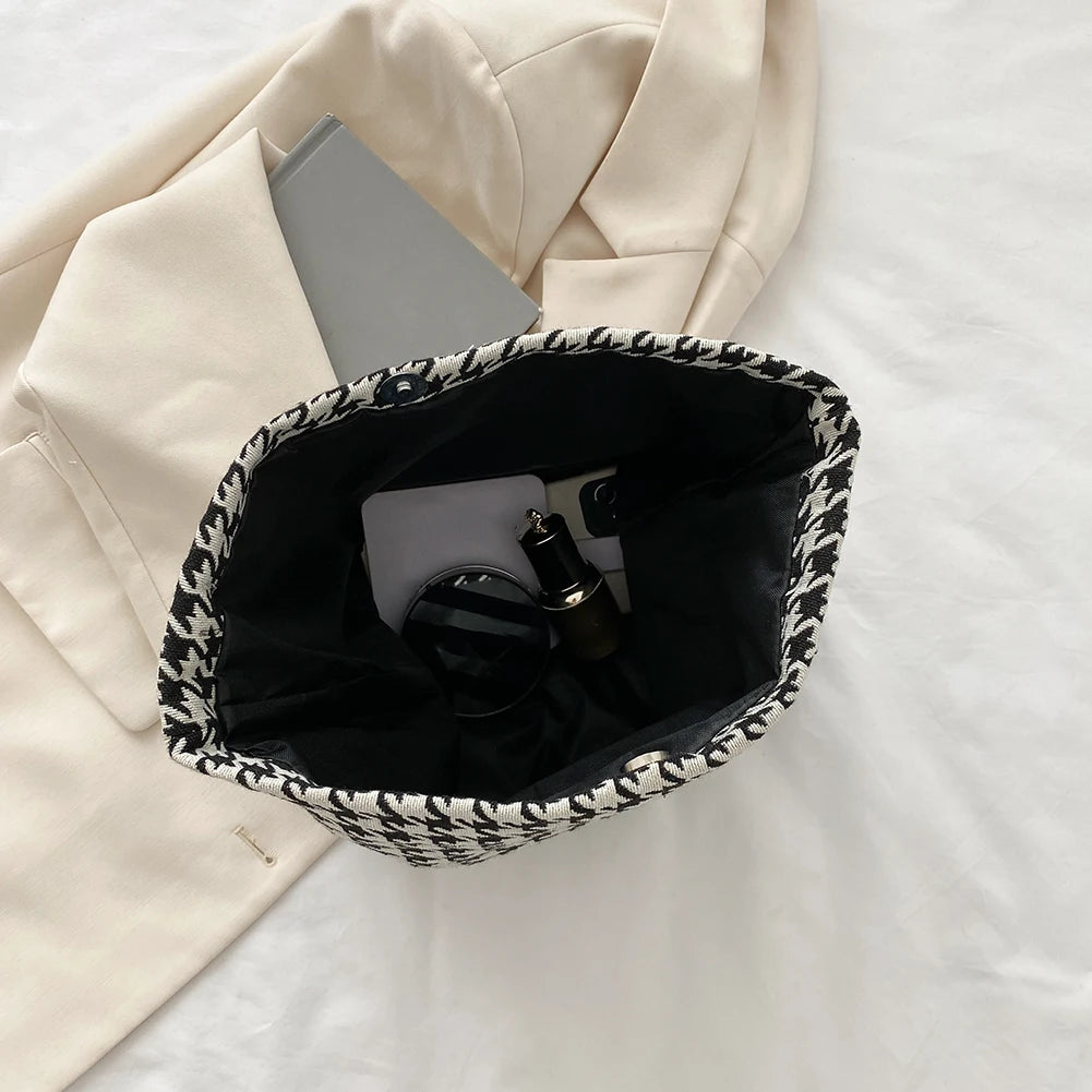 Stay stylish with this Jacquard canvas shoulder bag featuring houndstooth printing. It's perfect for shopping and everyday use with its large capacity and casual design.