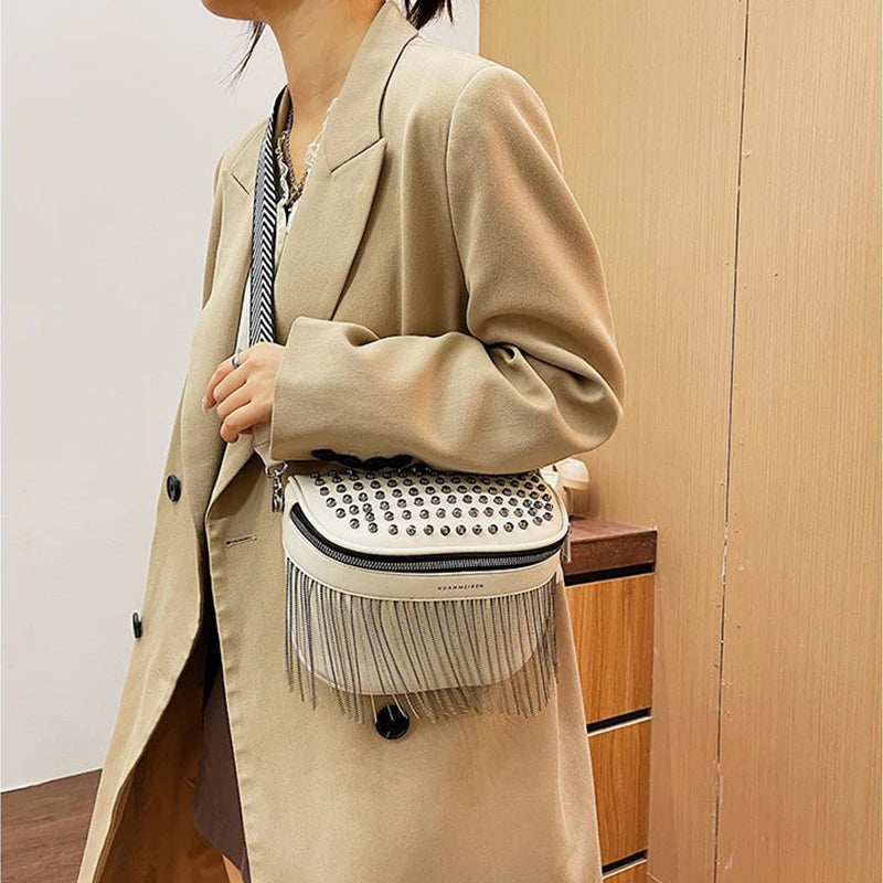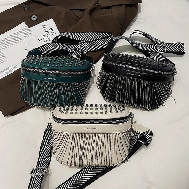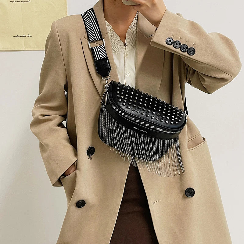 Stay organized and stylish with this fashionable chest bag. The tassel and rivet design adds a touch of flair to your look. Perfect for travel or casual outings.