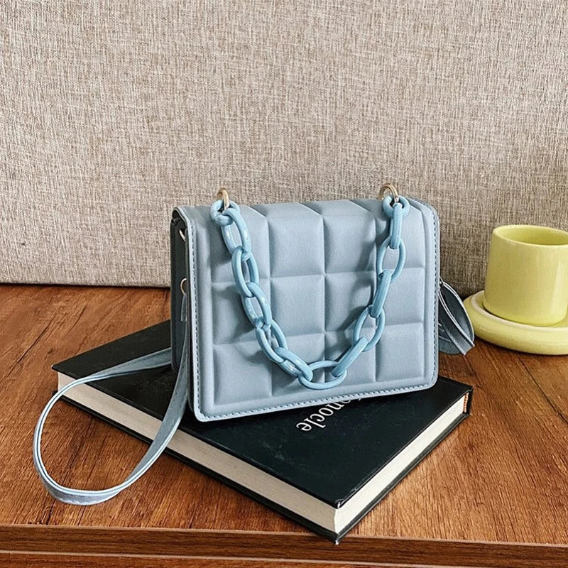 This women's crossbody bag features a square grid embossed design with a metal chain strap, making it a stylish and versatile accessory. The mini purse is perfect for carrying essentials and adds a touch of sophistication to any outfit.