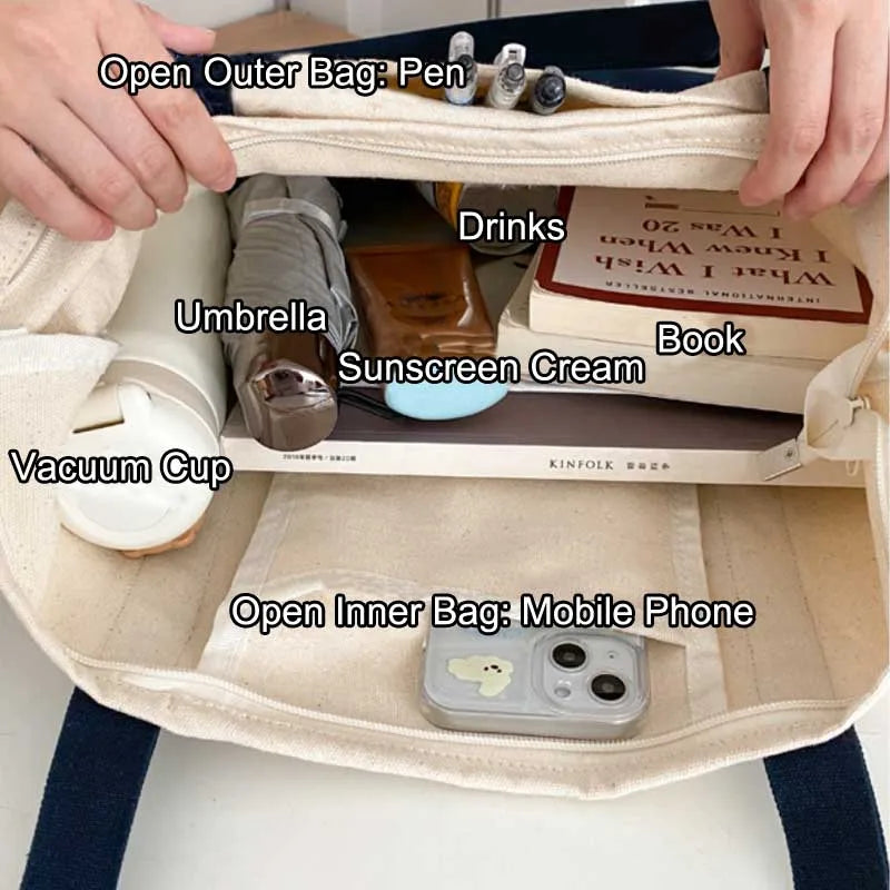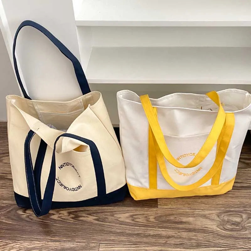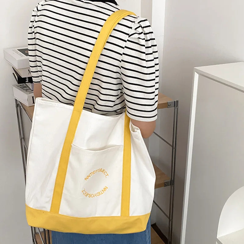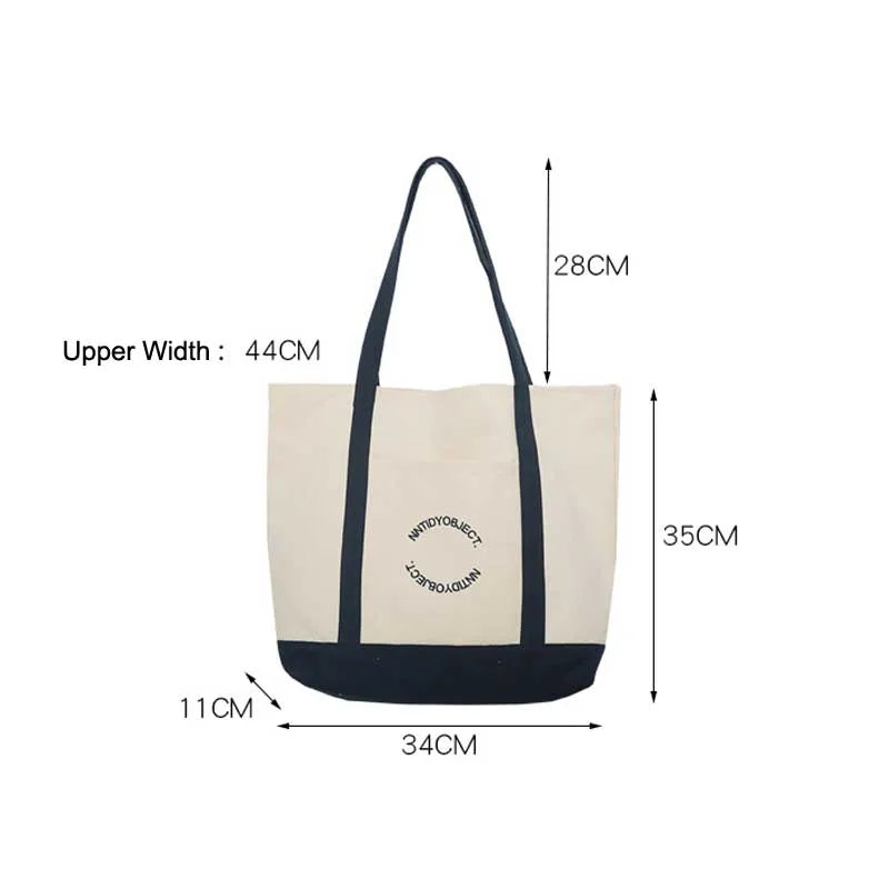 Stay stylish and organized with this chic women's handbag featuring letter printing and a convenient outside pocket. Made of durable cotton canvas, it's perfect for shopping and everyday use.