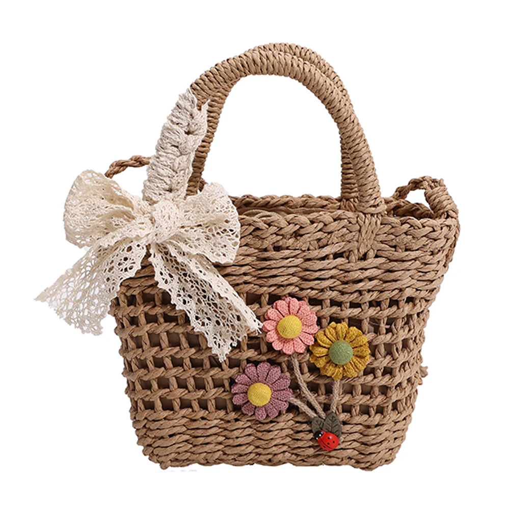 Elegant handwoven rattan flower handbag with lace bow design, perfect for ladies' shopping trips. Durable hardface material ensures long-lasting quality.