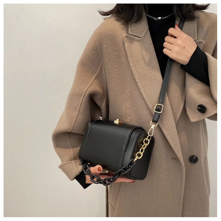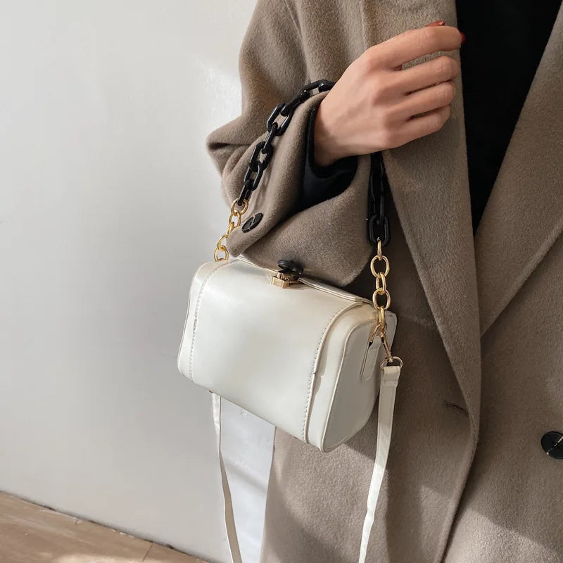 This stylish women's handbag is made of high-quality leather and features a chain strap for a chic look. It can be worn as a crossbody or shoulder bag, making it versatile and practical for everyday use.
