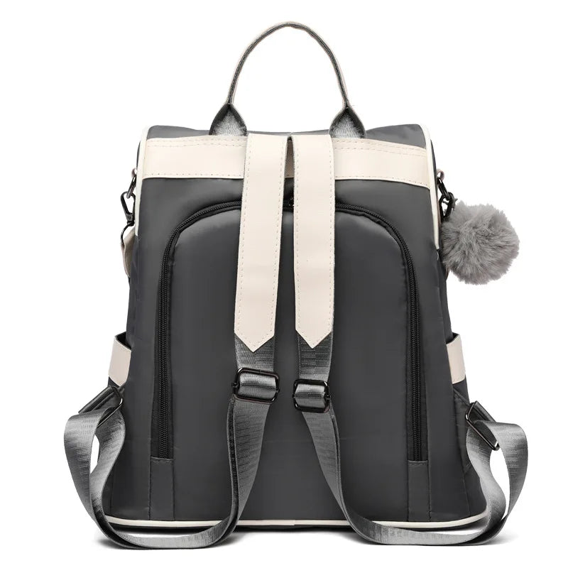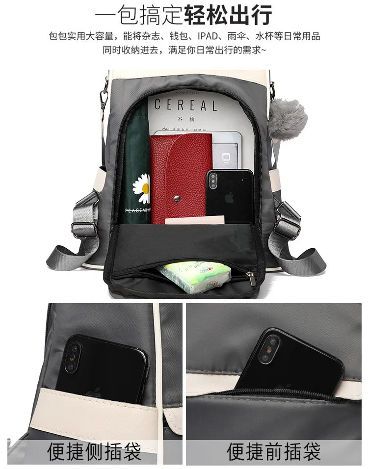 Stay stylish and organized with this Oxford cloth backpack that features a contrast design. Perfect for travel, it offers a large capacity and anti-theft features.