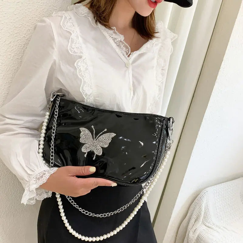 This shoulder bag features a retro design with a patent leather finish, adorned with a butterfly and diamonds. The textured pearls add a touch of elegance, making it a stylish choice for any occasion.