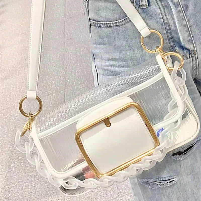 This stylish and versatile shoulder bag is perfect for any occasion. Made of transparent material, it adds a unique and modern touch to your outfit. The underarm design is comfortable to wear, and the crossbody strap allows for easy carrying. Ideal for everyday use or special events.