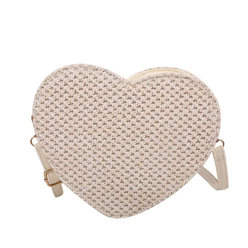 This women's summer straw bag features a sweet love heart shape design. It is perfect for beach trips, travels, or shopping. Stay stylish with this trendy handbag!