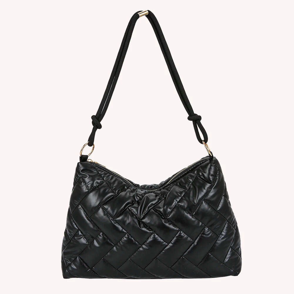 Stay stylish and cozy with this feather down handbag featuring a quilted lattice pattern. Perfect for winter wear.