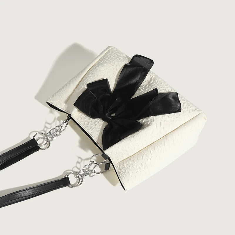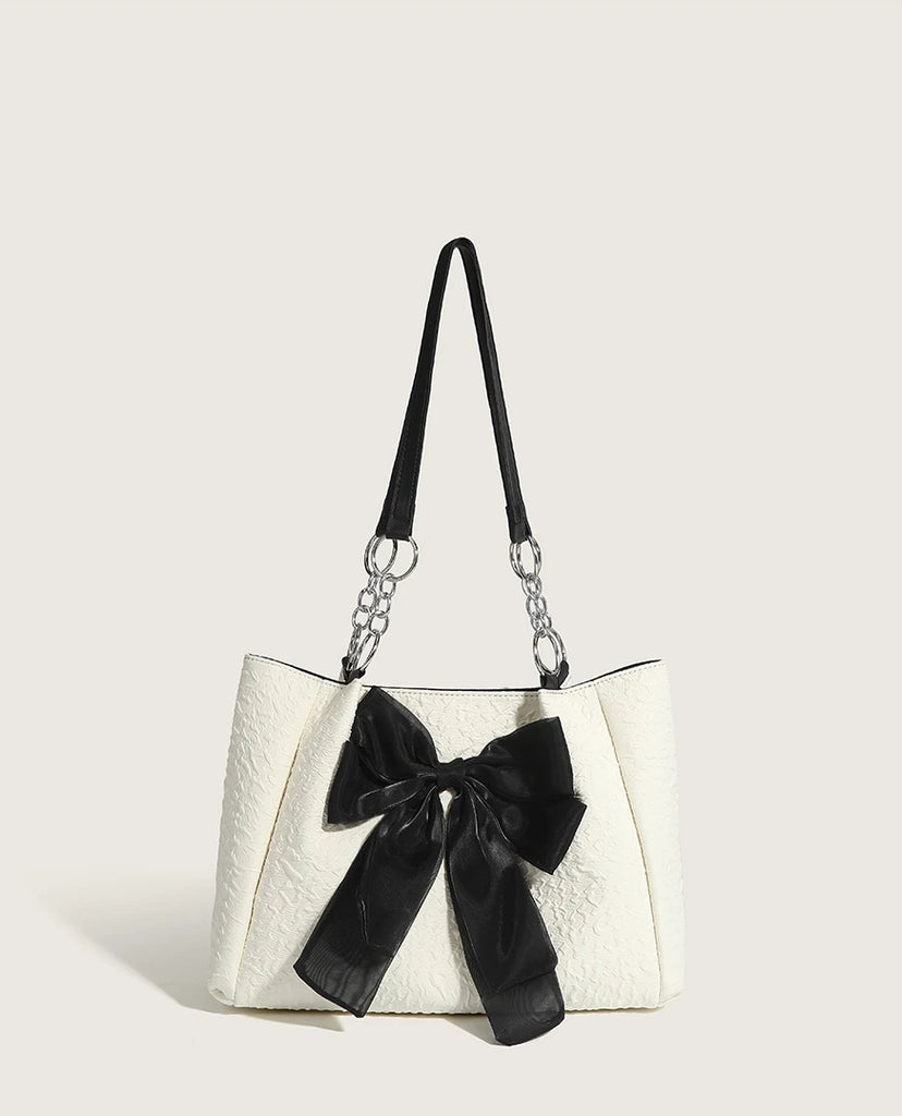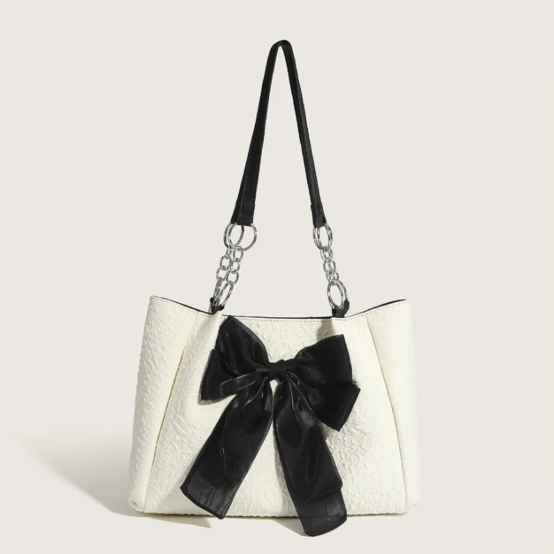 Description:This stylish tote bag features a metal ring and bow detail, offering a large capacity for all your essentials. Perfect for everyday use or special occasions.Features: Chic tote bag with a unique metal ring and bow design Spacious interior to hold all your belongings Pleated detailing adds a trendy touch...