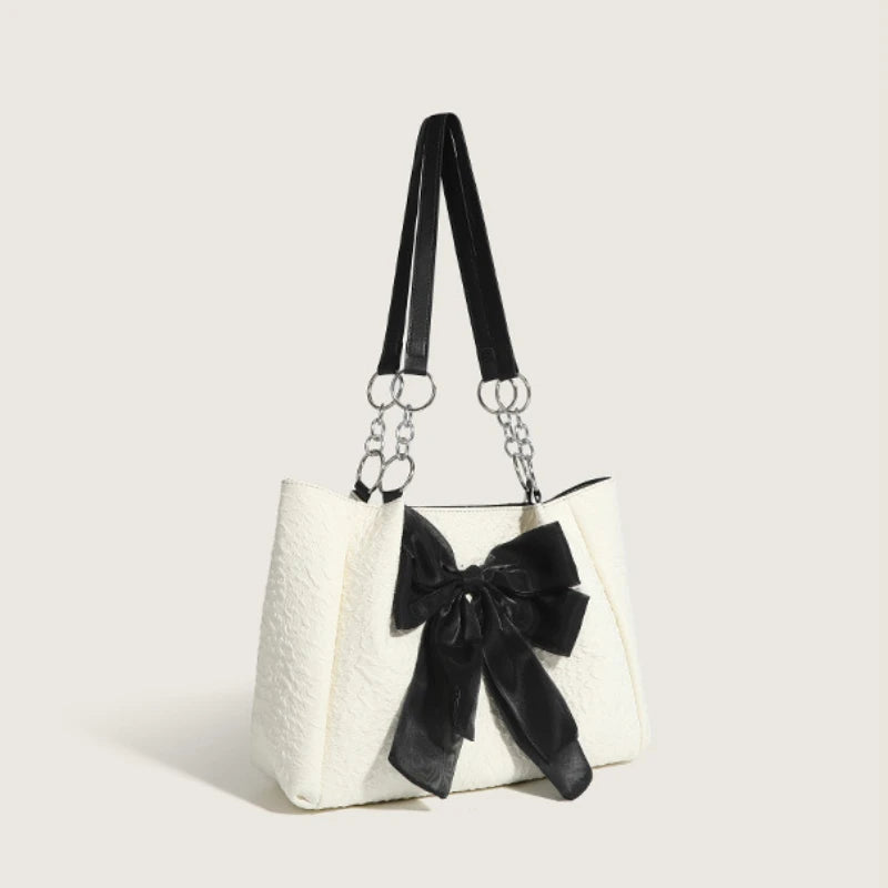 This stylish tote bag features a metal ring and bow detail, offering a large capacity for all your essentials. Perfect for everyday use or special occasions.