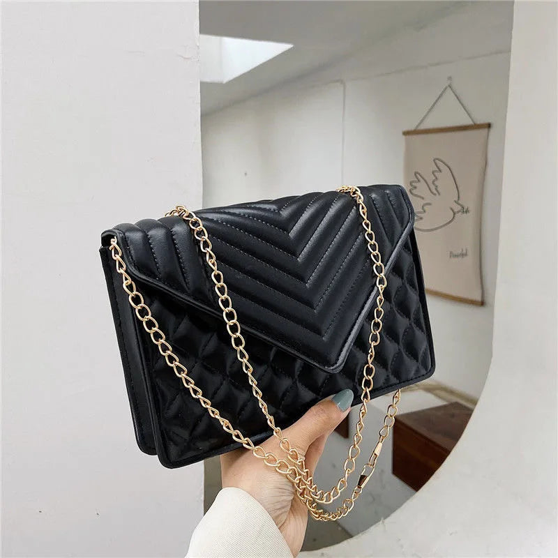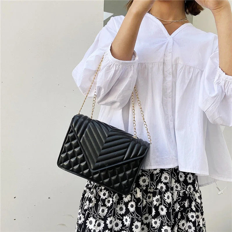 This stylish shoulder bag is made of high-quality PU leather with a lingge flap design. It features a chain shoulder strap and a crossbody style, perfect for everyday use.