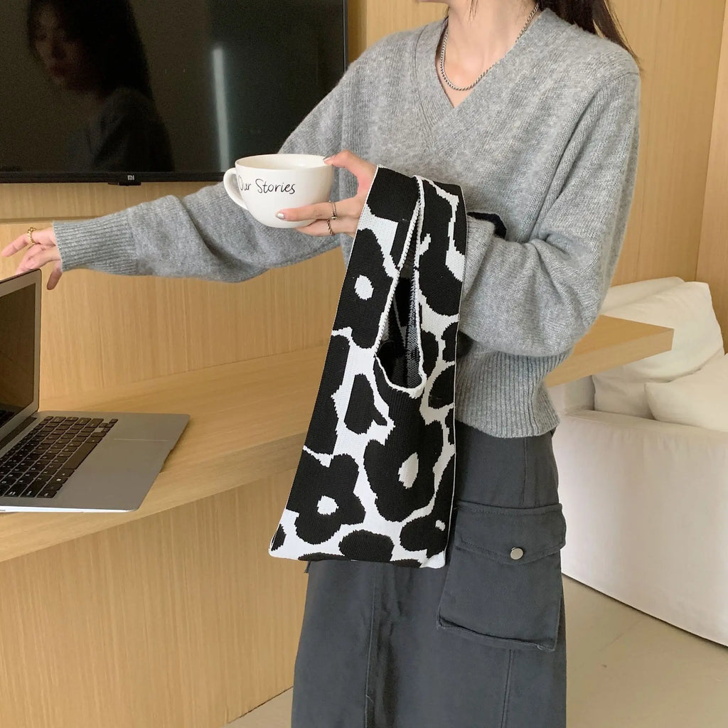 This stylish knitted handbag features a charming flower design that adds a touch of elegance to your outfit. It has a large capacity to hold all your essentials.