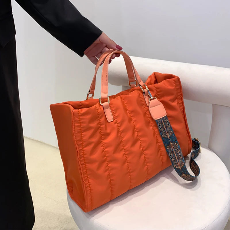 Stay stylish and warm with this padded nylon tote bag for women, perfect for winter. It features down cotton material that adds a touch of luxury to your outfit.