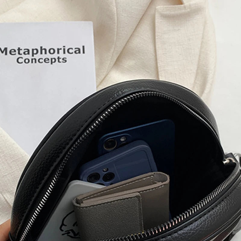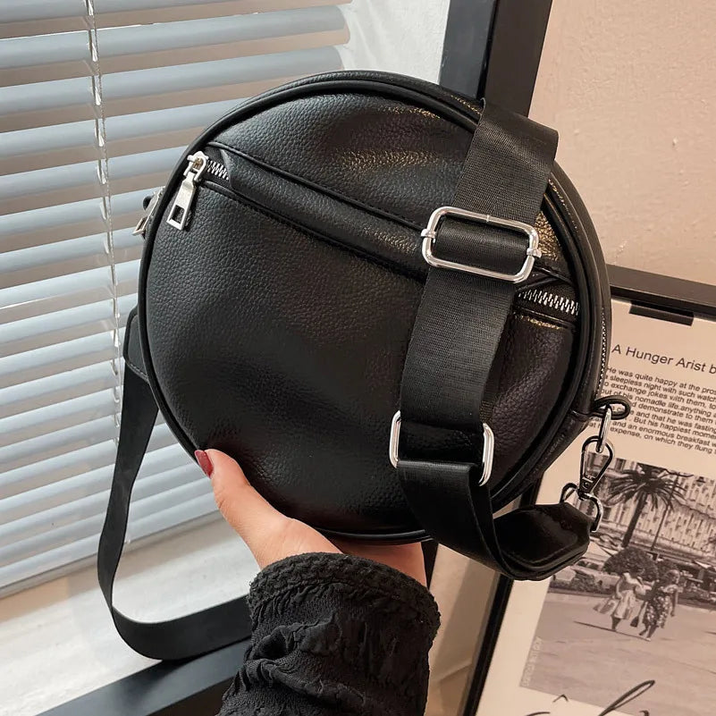 Elevate your style with this chic round shoulder bag featuring a wide strap and PU leather design. Perfect for carrying essentials in a fashionable and convenient way.