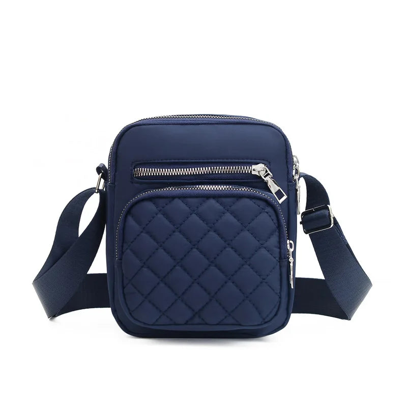 This women's shoulder bag is designed with a diamond pattern and features multiple layers for ample storage. It is made of durable Oxford cloth, can be worn as a single backpack or crossbody bag.