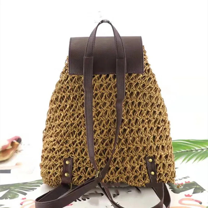 Women's Stitched Leather Backpack Woven Solid Beach Handbag
