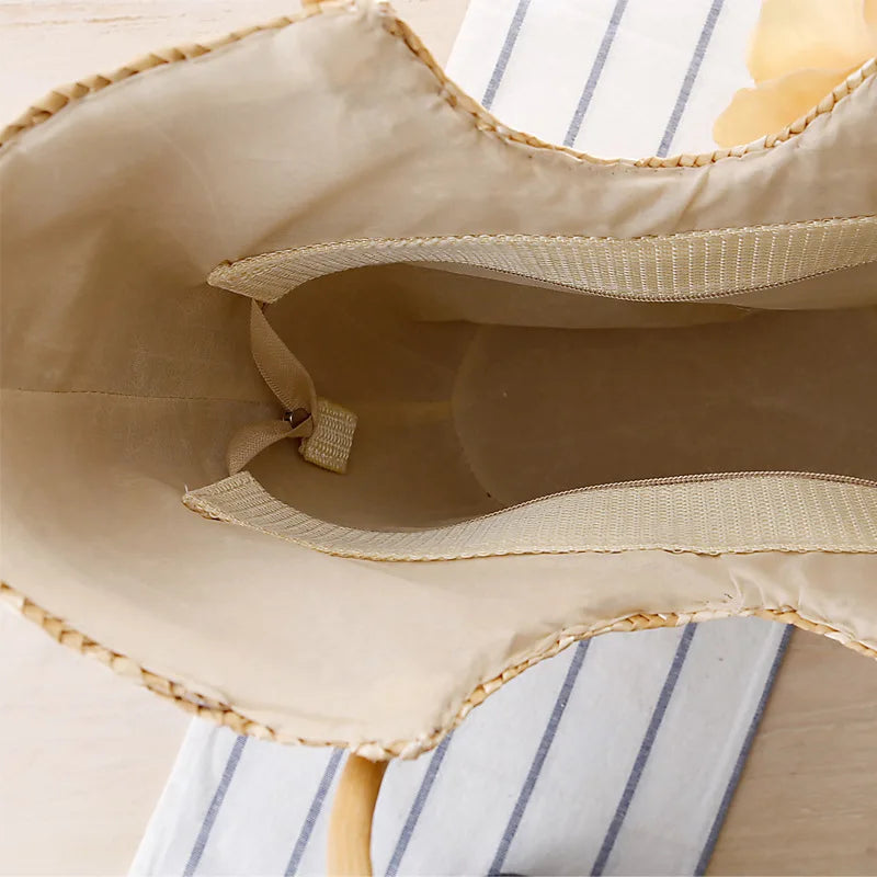 Elevate your beach look with this stylish rattan handle woven bag. It features a flower design and is perfect for carrying your essentials on sunny days.