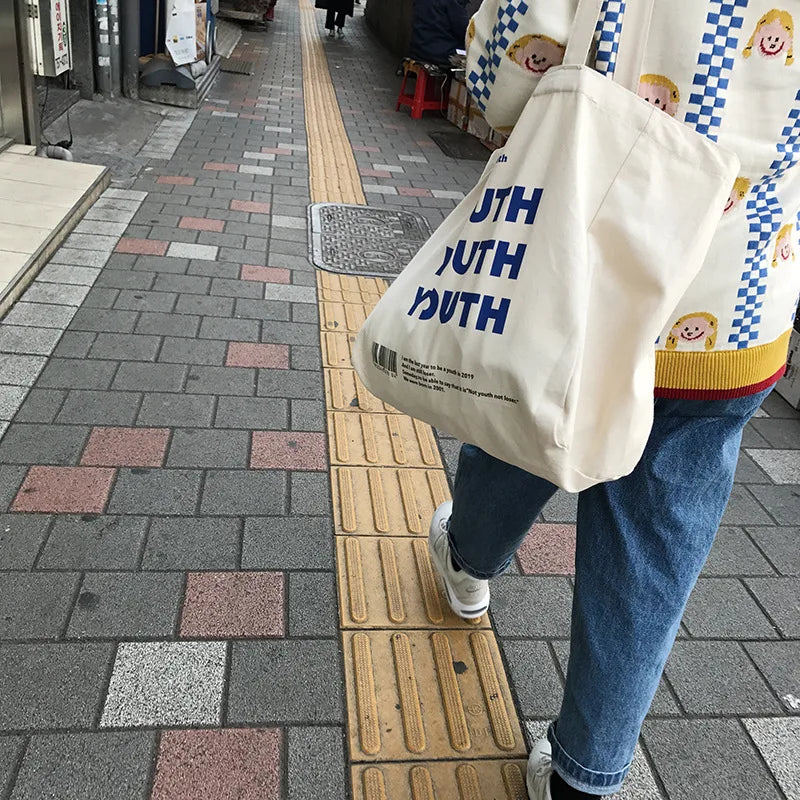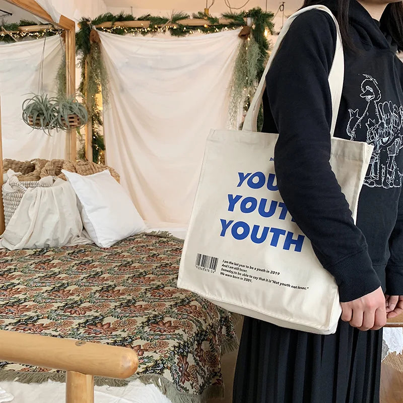 This canvas shoulder bag is perfect for shopping or everyday use. Made of eco-friendly cotton cloth, it features a trendy YOUTH letters print design.